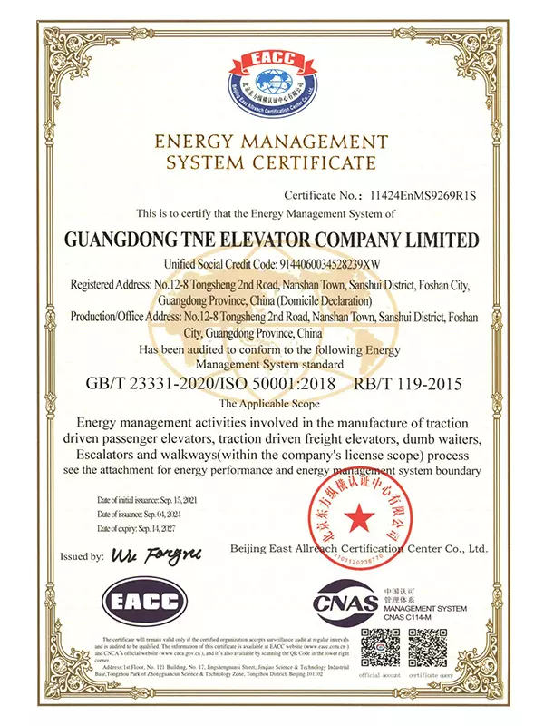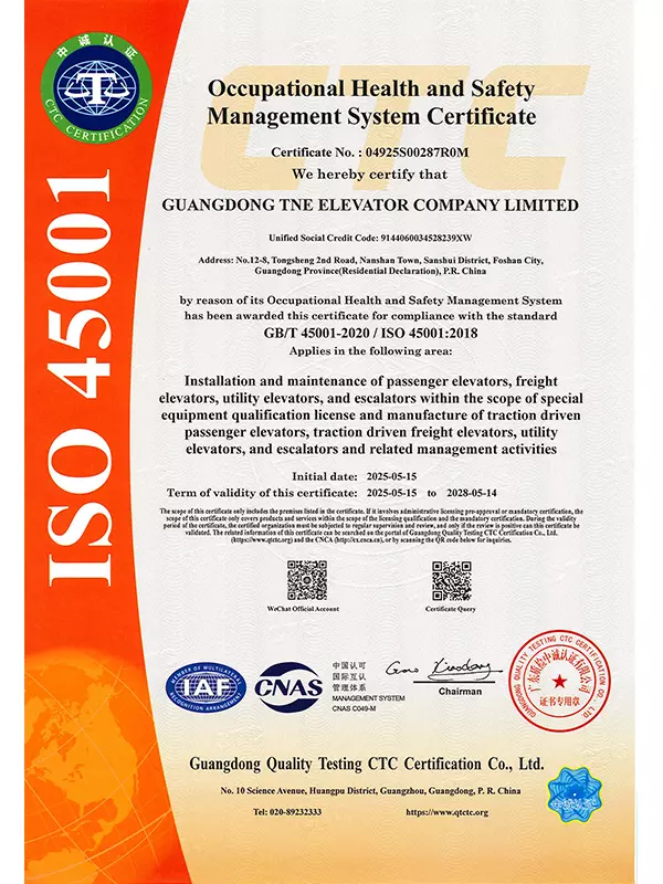 Upholding the Group's tradition of rigor and pursuit of perfection, our company founded Guangdong TNE Elevator Co., Ltd. in 2014. Located in Guangdong—a thriving hub for the elevator industry—the company embodies world-leading technology. Spanning an area of 66,000 square meters, the facility boasts an annual production capacity of over 20,000 elevators and features a 125-meter multi-functional test tower with six shafts. This infrastructure allows us to maintain the Group's commitment to precision by conducting timely and accurate tests on product craftsmanship.
