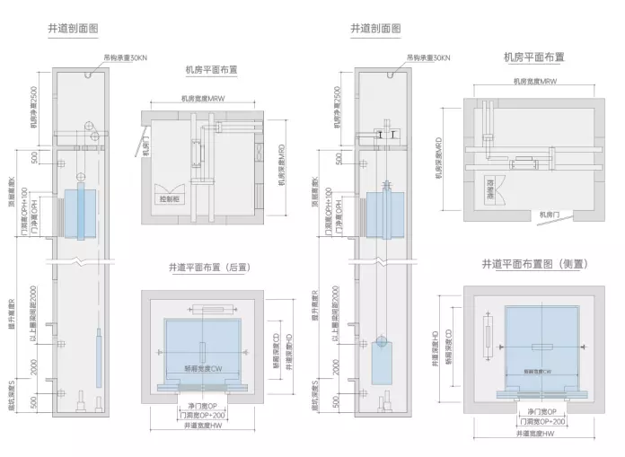 Tiefbauschema des Personenaufzugs im kleinen Maschinenraum