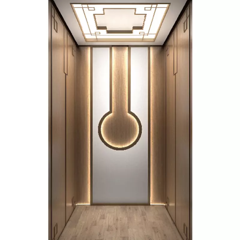 The car wall: wood veneer, champagne golden grain stainless steel, white matte leather, and hidden light strips