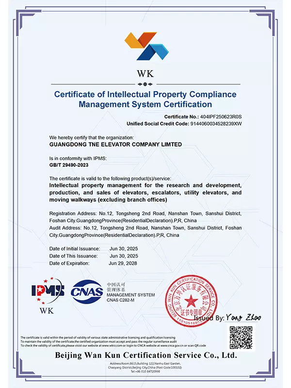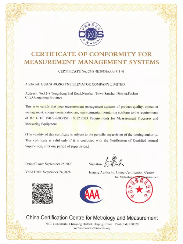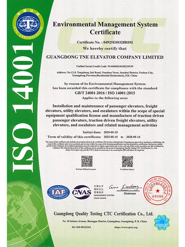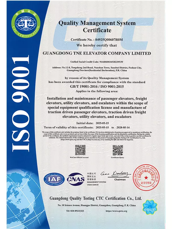 Upholding the Group's tradition of rigor and pursuit of perfection, our company founded Guangdong TNE Elevator Co., Ltd. in 2014. Located in Guangdong—a thriving hub for the elevator industry—the company embodies world-leading technology. Spanning an area of 66,000 square meters, the facility boasts an annual production capacity of over 20,000 elevators and features a 125-meter multi-functional test tower with six shafts. This infrastructure allows us to maintain the Group's commitment to precision by conducting timely and accurate tests on product craftsmanship.