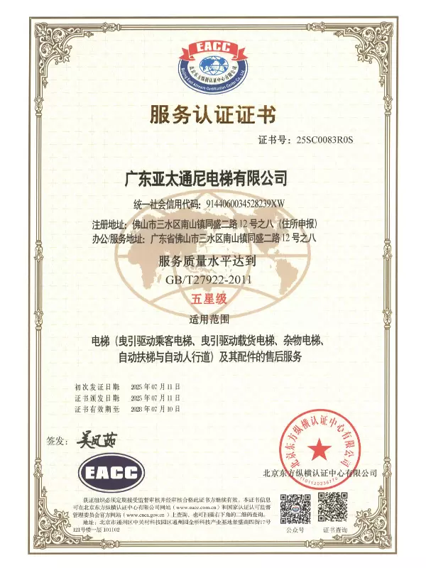 Guided by a team of highly skilled engineers with strong R&D capabilities, experienced technical professionals, and senior managers well-versed in modern enterprise practices, Guangdong Asia Pacific Tongni Elevator Co., Ltd. ensures exceptional product quality and reliable performance. We are further backed by a comprehensive and professional installation, maintenance, and repair network, along with a 24-hour nationwide hotline. This enables prompt troubleshooting and servicing, providing users across various sectors with complete, high-quality after-sales support.